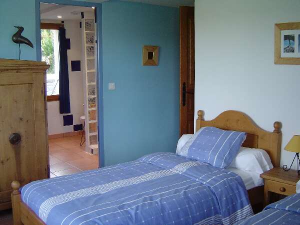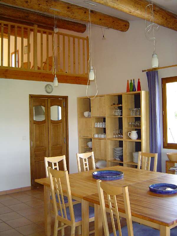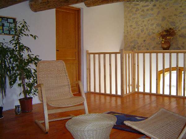Le CabanonThe Cabanon is a more modest gite next to our house, ideal for a couple, or family if the sleeping platform is used. The gite is made up of two buildings. The Main bedroom/studio has twin beds, and a cot can be provided on request. It also has a small table for eating indoors, on those rare occasions when you can't eat outside on the terrace and a seating area. The kitchen, Shower room, W.C, and mezzanine sleeping area are in the adjacent building, which is small, but full of charm, with thick stone walls and wooden beams. The kitchen area has an electric oven with 4 burner Gas hob, fridge and dishwasher. The mezzanine sleeping area above has two single beds, with access via a wooden ladder. It is not suitable for the infirm, or for very young children. The two parts of the Cabanon have doors leading onto the terrace, which has a table and chairs for eating "al fresco". Please note that you do have to go out onto the terrace for a few steps, to go from the main bedroom to the shower room and WC. The Cabanon is next to our house and terrace. It has its own small terrace for eating, and you can relax on the grass, in the shade of the cherry tree on hot afternoons, but it does not have a private garden area. Le Cabanon